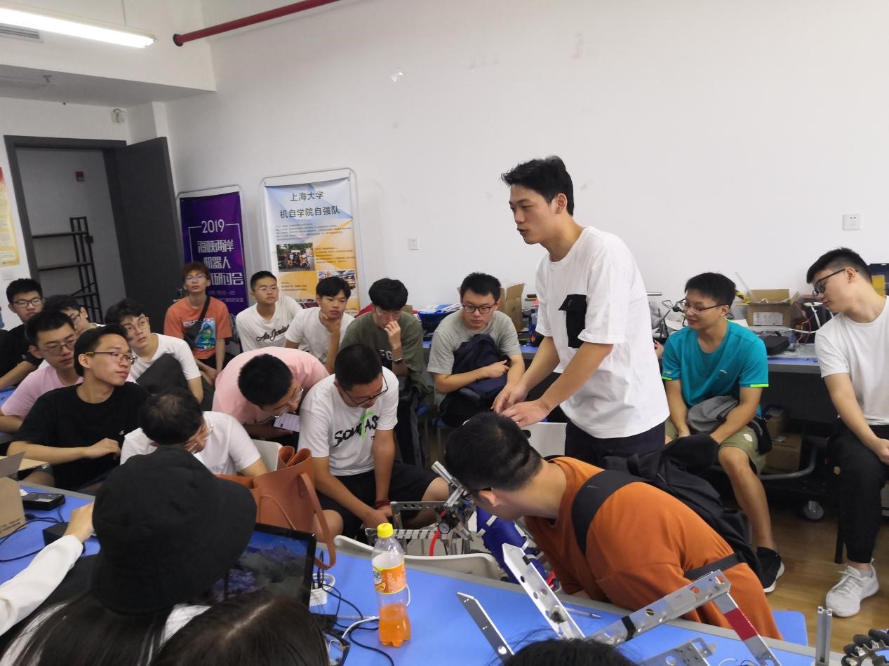 自强队临时党支部书记、投篮机器人组负责人研三研究生高洋,为19级自动化专业学生详细地介绍了由学生自己研制的投篮机器人的底盘、篮球弹射装置、控制板的设计制作等各个部分的组成和运作原理,为便于讲解,高洋把实体机器人进行了分解,让学生近距离接触,许多学生产生了浓厚的兴趣并不断提问;同时播放视频也展示2018年和2019年获冠亚军的精彩片段,赢得了学生们的阵阵喝彩。