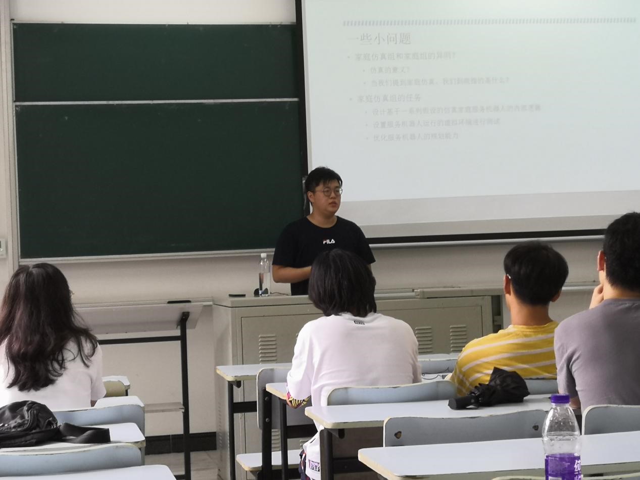 仿真组研三刘璇和大四本科生丁屹涵,用讲课和视频通俗易懂的介绍机器人仿真的原理,丁屹涵深有感触地告诉学生们,虽然仿真机器人不如实体机器人那么直观,都是以代码的形式来表示,编程虽然比较枯燥,但同样也会給你带来成功的乐趣。他也与学生们分享了仿真组的拼搏精神,几年来仿真组始终保持比赛的冠亚军。