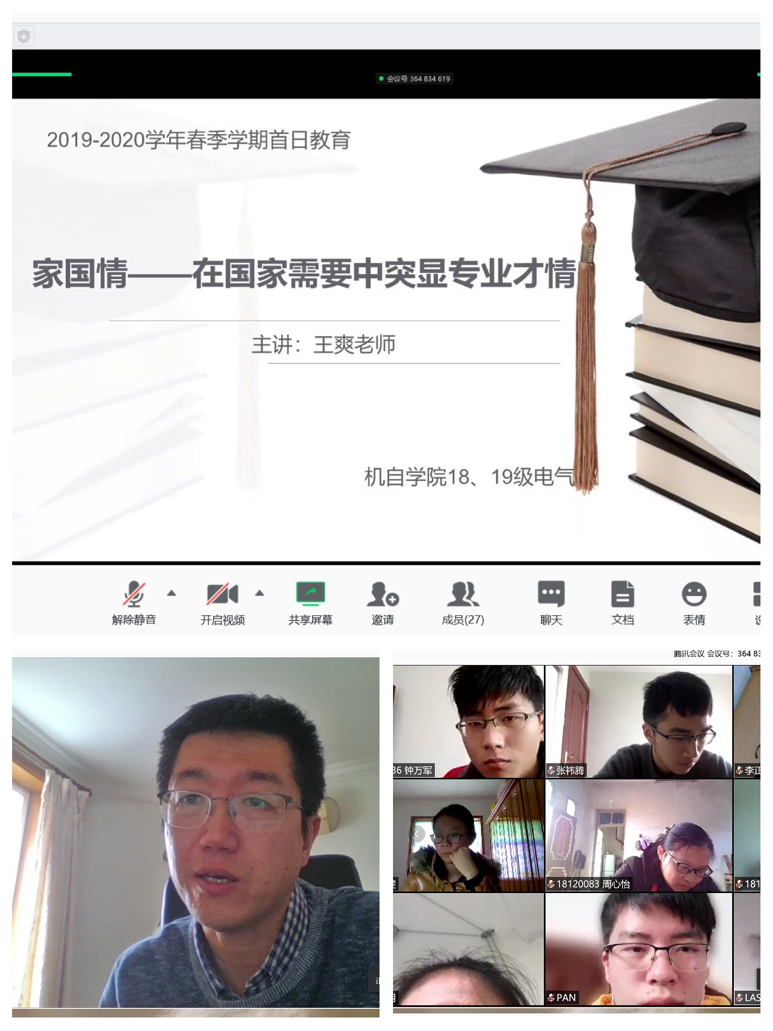 2020年4月6日下午13:00,我院18级、19级电气工程及其自动化专业在腾讯会议网络平台召开了2019-2020学年春季学期首日教育。本次教育活动由辅导员孟蓉老师主持,特别邀请到了我院专业任课老师、本科生班导师王爽老师分享了题为:家国情——在国情需要中突显专业才情的主题讲座。