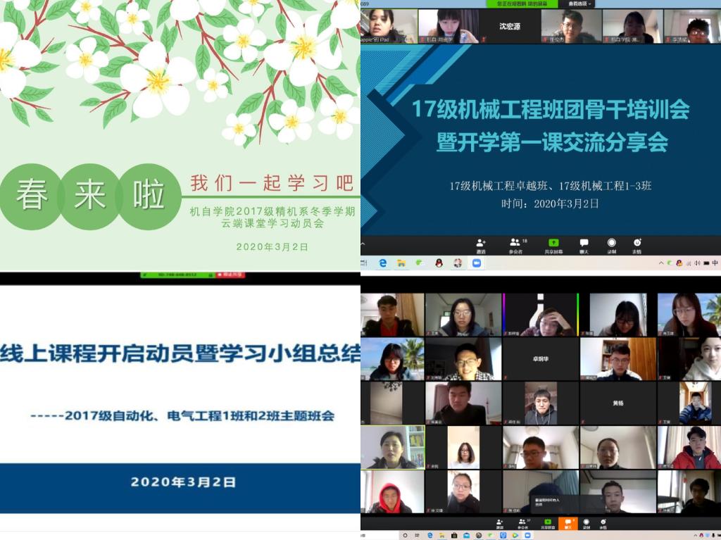 第一部分课程之后,我院全体师生通过在线教学平台和点播的方式,延续六个专项的课程学习。大家通过课程,了解了新冠肺炎防控相关知识,掌握了日常防控的基本方法和手段,并在课后与同学进行了探讨交流。上午观看完“同一堂课”,三个系各班级在辅导员老师的组织下,又通过ZOOM等平台开展了丰富的线上班会活动,党员、积极分子、班委等核心成员均积极参与到交流讨论中来。在班会中,各班主要围绕疫情知识学习、网课授课要点、班风学风建设等话题开展讨论,有的班组织了对第一堂课的讨论,有的班组织同学在冬季学期诚信考试承诺书上签名,有的班对如何提升网课学习成效展开了头脑风暴……大家热烈地进行讨论,体现了机自学子对即将到来的挑战满满的信心。