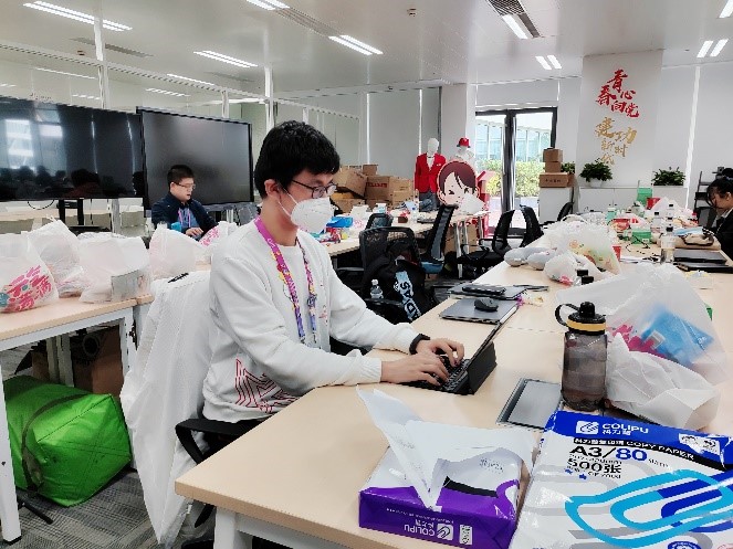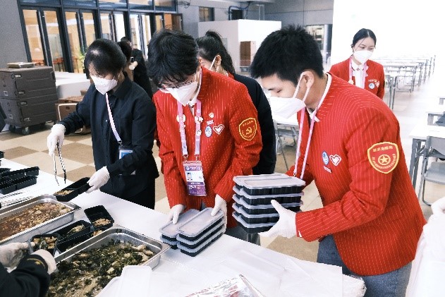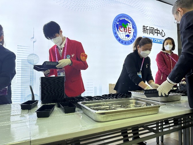 我分配到的岗位是新闻宣传辅助岗,不同于其他小组,我们主要为新闻中心里的工作人员提供餐饮保障。参与盒饭组的工作,我觉得很光荣,因为给工作人员提供一日三餐十分重要。在这几天的工作中,带队老师和小叶子们让我感觉到这是一个十分有爱的大家庭,在我们忙得腾不开手时,领导也会来帮忙,工作氛围十分融洽。每日晨会过后我们便会开始组装400多份盒饭的工作,每份盒饭又由三个部分组成,工作量可以说是巨大,因此我们岗位先于新闻中心的其他小叶子开始工作,在组装完盒饭后又需要马上分发盒饭,努力让新闻中心的工作人员享受到最好的服务,吃好每一顿!我在这几天的工作中认识了很多有趣的新朋友新同学,各位老师、工作人员也给予了我们最大的帮助,十分感谢他们,我才可以顺利地完成本次志愿服务工作。希望自己可以继续加油,展现出上海大学我院“小叶子”的风采!