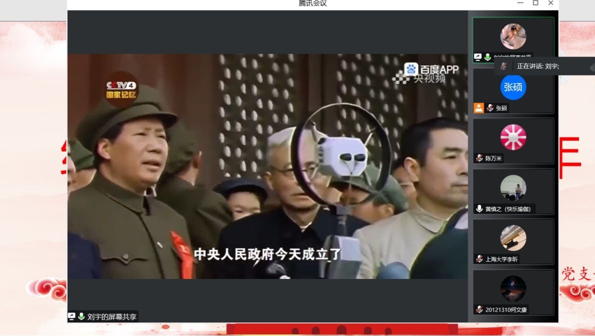 在嘹亮的国歌声中,活动正式拉开了帷幕。首先由研二的刘宇同学播放她收集并制作的伟人毛泽东的短片。在短片中,开国大典上,毛主席庄严向全世界宣告:“中华人民共和国中央人民政府今天成立了!”抗美援朝时,他霸气发声:“他们要打多久我们就打多久,一直打到完全胜利!”1893年的今天,毛泽东出生于湖南湘潭。缅怀伟人!