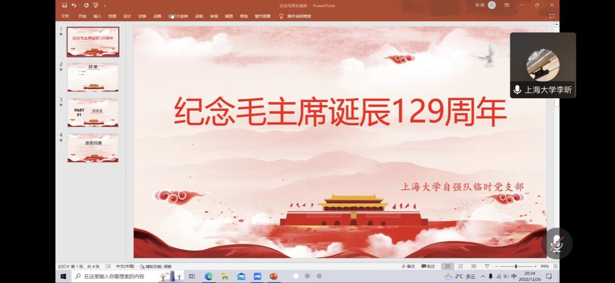 12月26日晚上八时半,我院自强队在指导老师王海宽等老师的关心指导下,线上开展了纪念毛泽东诞辰129周年纪念活动。参加本次活动的指导老师有李昕老师、黄慎之老师和荣誉指导陈万米老师,以及近十名研究生和两名本科生代表。本次纪念活动由自强队临时党支部负责人张硕主持。