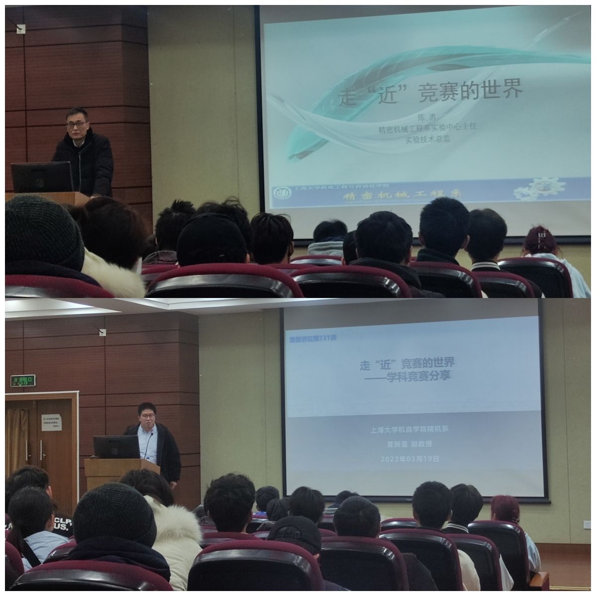 下午15:00,在蔡冠深讲堂,为帮助同学们了解和专业相关的竞赛信息,特邀请了精密机械工程系实验中心主任、实验技术总监、高级实验师陈勇老师和测控技术与仪器教研室副主任、夏新星副教授为同学们开设了两场集智讲坛——走“近”竞赛的世界。两位老师分别从自身擅长的领域为同学们介绍了各类竞赛项目,从报名注意事项、赛事历届比赛作品等方面带领大家走近竞赛的世界。讲座中还邀请到了第十届全国大学生光电设计竞赛三等奖、第十届全国大学生光电设计竞赛东部区赛一等奖获奖者、测控技术与仪器专业的赵艺菲同学,2022年中国大学生机械工程创新创意大赛机械产品数字化设计赛一等奖的获奖团队,来自机械电子工程专业的李畅、朱致辰、项重远三位同学为大家带来分享。“竞赛不是大佬才可以参加……”同学们朴素的分享中,透露出他们在竞赛中得到的锻炼与成长,台下的同学们听了都非常激动,希望自己能够尽早参与到各类竞赛中。在首日教育结尾,李云龙老师就今天的首日教育内容进行了总结,并重点强调了诚信考试、考场规则、日常上课出勤等问题。