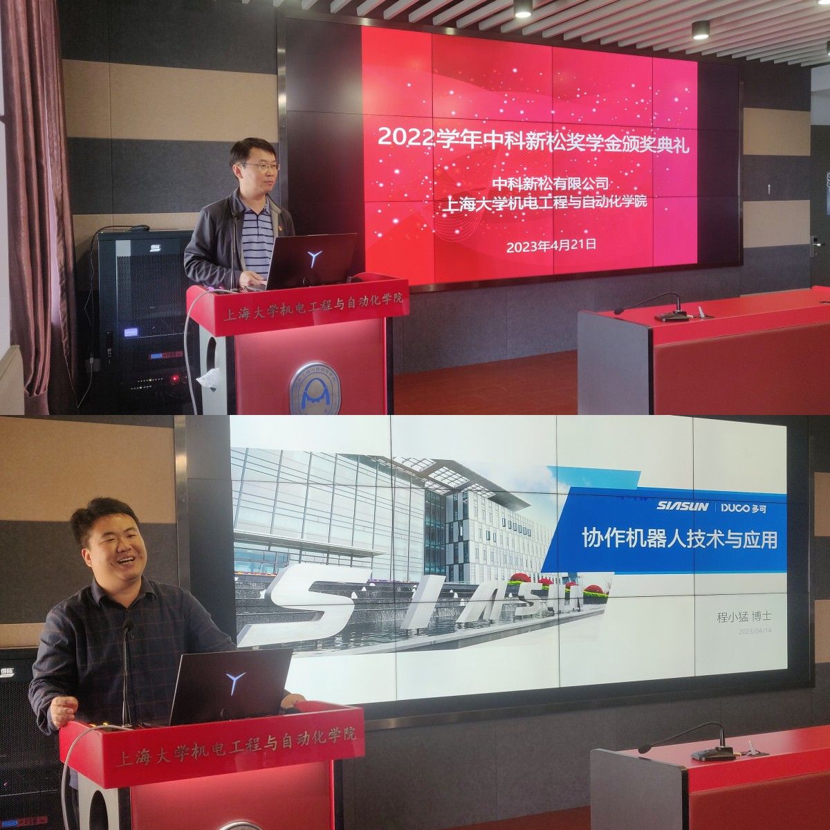 4月21日下午,中科新松奖学金颁奖典礼暨机器人专题讲座活动在我院伯时会堂成功举办。中科新松有限公司研发中心副院长程小猛、投资与战略规划部副部长贾龙冲,我院党委副书记、副院长杨扬,机自系党总支书记赵其杰、副书记陈铭、副主任张健滔,以及本届获奖学生等共同出席仪式,自强书院本科生及我院研究生也踊跃参与讲座聆听。活动由机自系系主任田应仲主持。