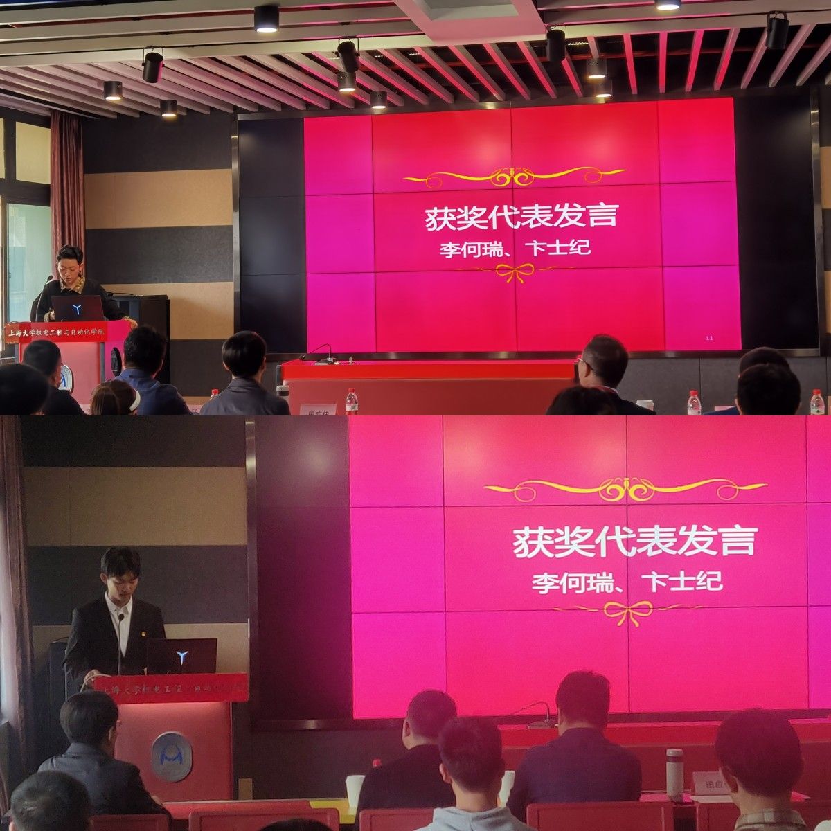 颁奖仪式上,我院党委副书记、副院长杨扬代表自强书院和我院,向中科新松有限公司赠送纪念品,感谢中科新松在提升书院人才培养质量方面提供的资源支持,希望借机器人讲坛、奖学金颁奖仪式等为校企合作提供新的契机,共同加速推动校企共赢共进,加速人才共育共促。田应仲老师感谢自强书院和我院对校企合作的支持和指导,并邀请领导嘉宾们为15位本硕博获奖者颁发荣誉证书。李何瑞、卞士纪两位获奖者代表在交流发言中均表示,获得新松奖学金殊荣,有温暖、有感激,亦深感坚守专业“初心”、躬行实践的责任,相信通过努力定能继续在专业领域书写精彩。