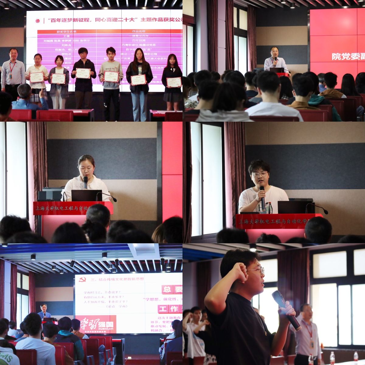 会上,学院为“百年逐梦新征程,同心喜迎二十大”获奖作品颁奖。所有投稿作品均由学生自主创作完成,他们用专业所学献礼党的二十大,纪念上海大学建校一百周年。自动化专业王倩同学作为获奖代表交流发言。她讲到,当代中国青年生逢其时,施展才干的舞台无比广阔,实现梦想的前景无比光明。“奋斗吧,青年!”去谱写属于我们的新篇章。