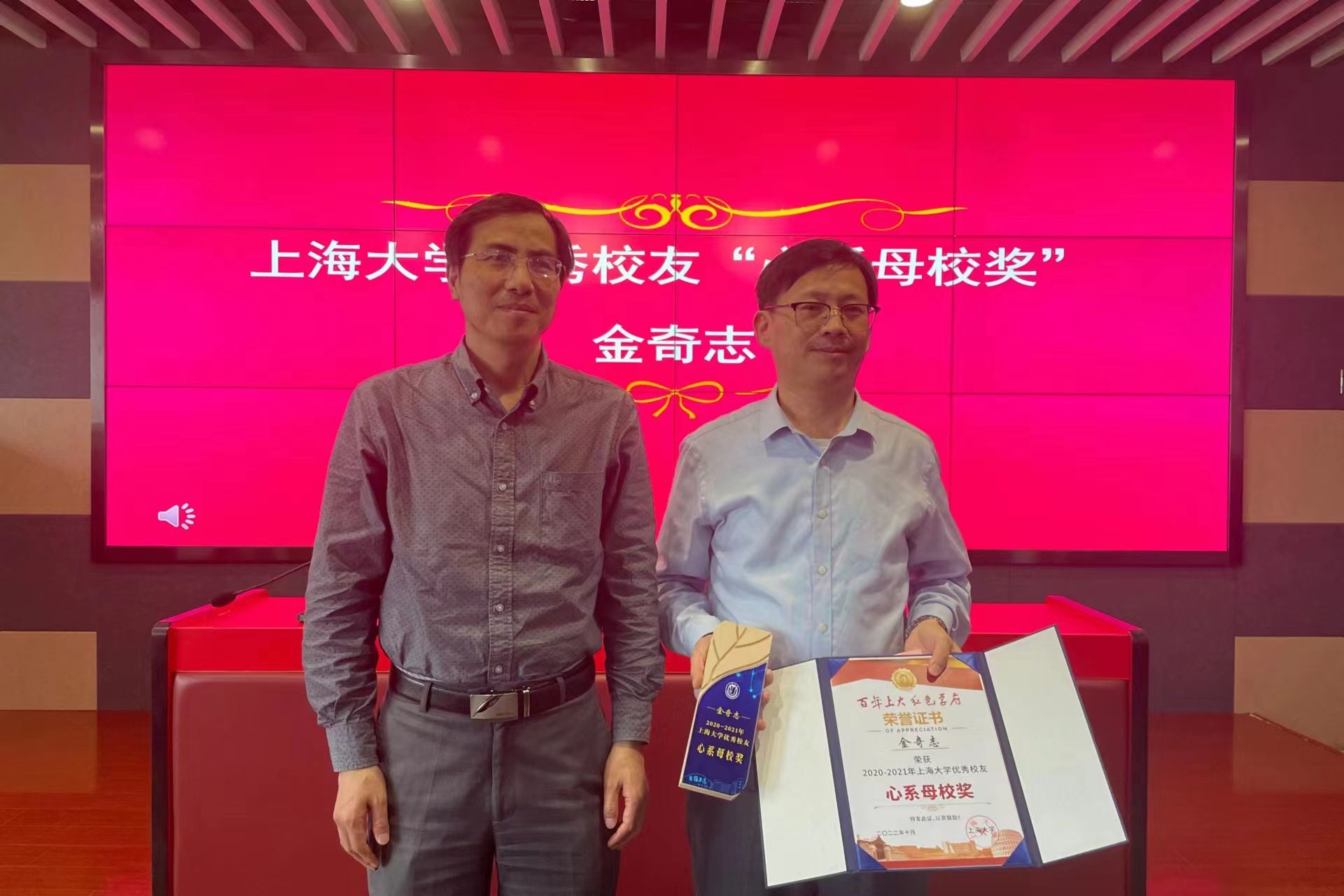 “上善若水、海纳百川、大道明德、学用济世”是上大校友共同的价值追求,金奇志校友一直尽己所能,汇集各类资源以支持母校的建设与发展。他于2020年捐赠设立“金步科技企业奖学金”,鼓励青年学子争做品学兼优,德、智、体、美全面发展的优秀人才,近三年累计有百名本科生荣获该奖学金。同时,他还与学院建立了大学生科技孵化基地、创新创业基地和就业实习实践基地,起到校企合作的引领与示范作用。为感谢金奇志校友长期以来对院系的热切关心和大力支持,吴智政老师为金奇志校友颁发了上海大学优秀校友心系母校奖。