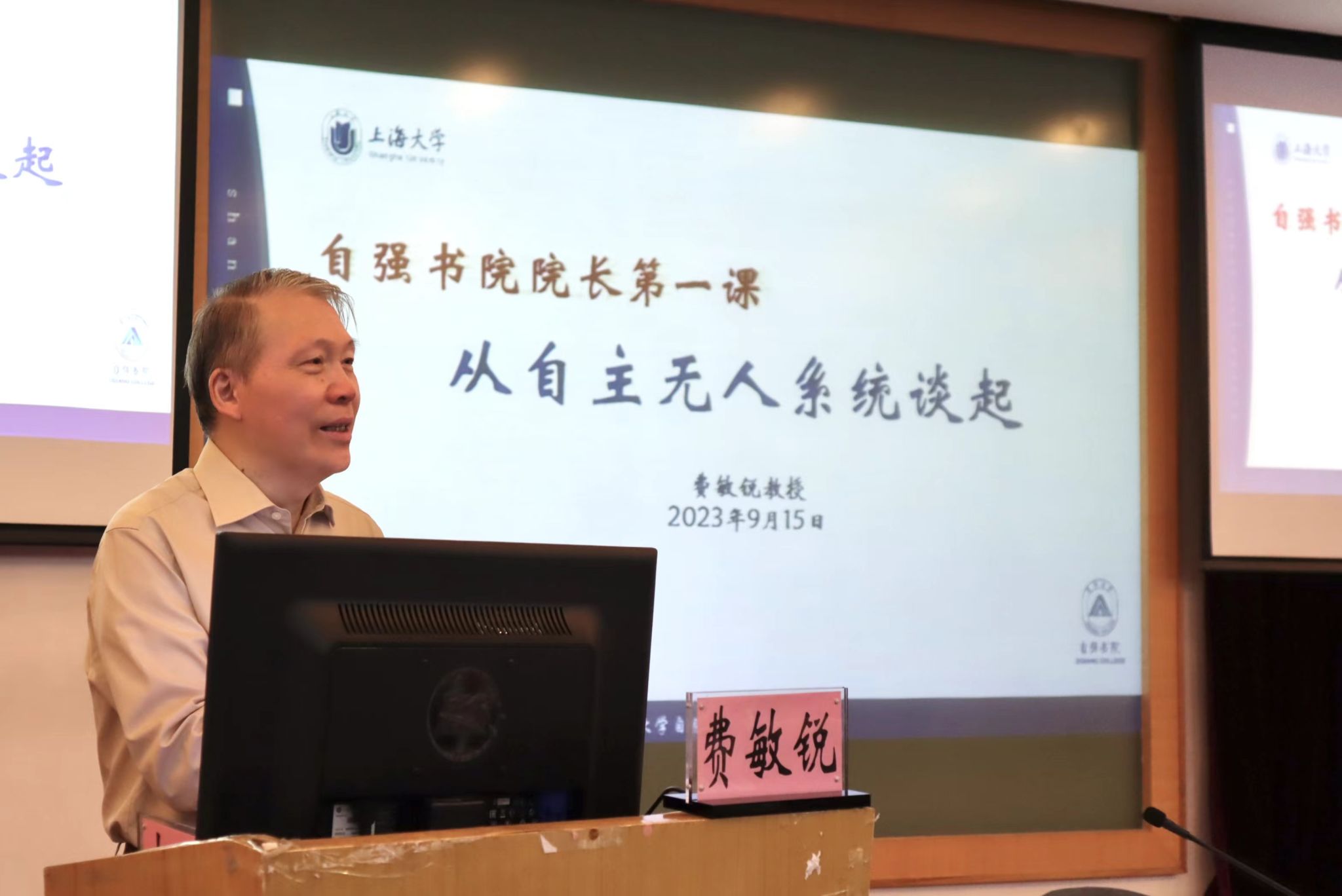 接着,自强书院院长费敏锐开展了《从自主无人系统谈起》的主题讲座。从无人机到无人驾驶,从无人机系统的威胁到无人系统涉及的支撑技术,费院长深入浅出地讲述科研知识与现实应用,并拓展到同学们需要具备的学科素养和知识结构。费院长以其自身的求学、教书、科研的经历激励同学们树立信心、积极进取,在求学之路上培养“诚信,勤奋,求实,创新”的坚实品格。