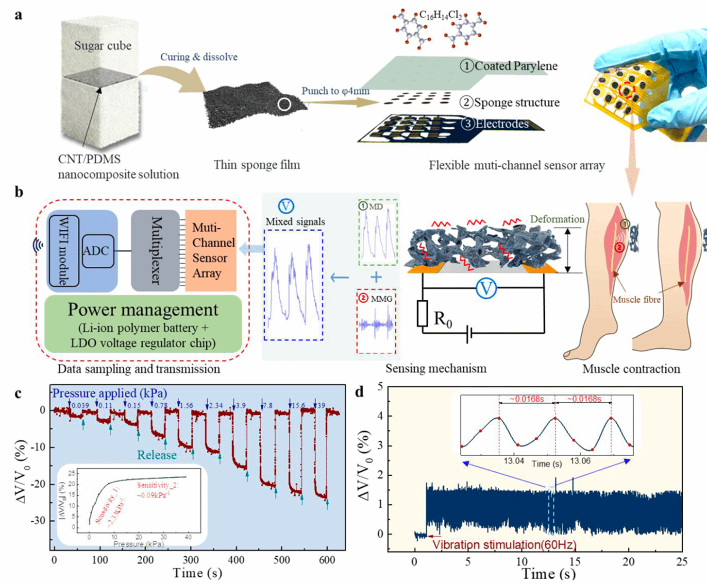 通过研究微纳仿生制造工艺,研究了基于压电、电容式等原理的高性能柔性可穿戴传感器,实现了手指和下肢肌电信号和肌肉收缩图谱信号的高灵敏度检测,结合机器学习算法,实现了多种行为动作的识别,相关成果发表在Advance Science等期刊和国际上。