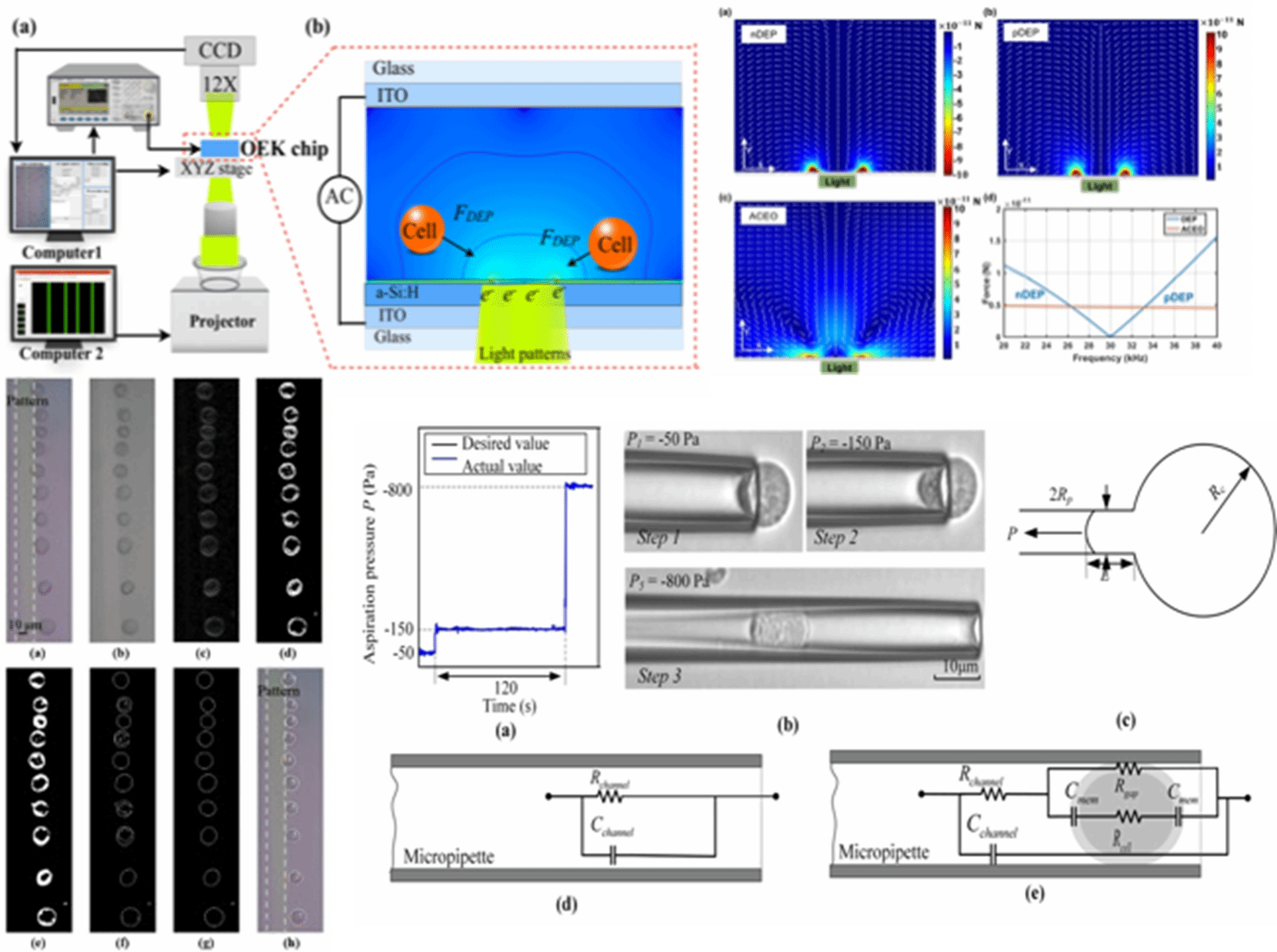 基于不同形态和种类细胞的介电泳力模型,提出并研究了基于光诱导操控机制的细胞筛选及参数控制方法,实现了临床脱落细胞样本中的癌细胞筛选收集;针对细胞机电特性检测依赖于不同的激励方式,难同步检测的问题,项目组基于微吸管操作机器人设计了截面梯度化的细胞捕获器件,建立了细胞电学和半空间吸附模型,提出了基于视觉反馈和电学阻抗谱激励的同步调控方法,基于微吸管捕获技术,实现了单细胞机电特性四个参数(粘滞系数、弹性模量、平衡模量、膜电容)同步获取。相关成果发表在IEEE Transactions on Automation Science and Engineering,IEEE Transactions on Biomedical Engineering等期刊上。