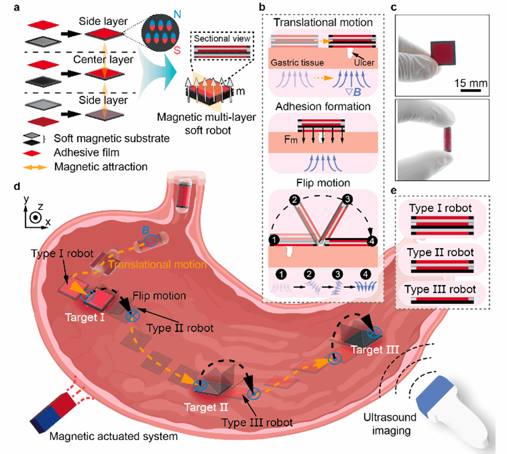 通过设计并优化磁化凝胶层间的磁力作用, 提出了一种多层磁性机器人的自组装方式;研究了磁场控制的黏附-脱离机制,提出了结合生物粘附机制的磁性机器人多靶点可控粘附转移机制,首次在活体猪胃内实现了多靶点粘附递送;相关成果发表在Nature Communications 等国际期刊上。
