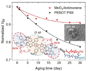 采用一种新型的氧化钼/锑烯混合型非富勒烯受体-惰性空穴传输层来提高有机光伏器件的稳定性。在氧化钼前驱体溶液中掺杂二维材料锑烯制备新的空穴传输层以取代传统的PEDOT:PSS,实现了高效稳定的非富勒烯有机光伏器件。氧化钼/锑烯混合型惰性空穴传输层的使用有效地消除了非富勒烯受体中INCN基团和PEDOT:PSS中醌式结构之间界面反应。实验结果表明,基于不同体系的非富勒烯有机光伏器件,如PM6:IT-4F和PM6:Y6等,器件的能量转换效率分别达到了12%和16.7 %,证明了氧化钼/锑烯混合型空穴传输层在实现高性能非富勒烯有机光伏器件器件上具有普适性。对比基于传统PEDOT:PSS空穴传输层,采用氧化钼/锑烯混合型惰性空穴传输层可以在实现高效的同时,很有效地提高非富勒烯有机光伏器件的稳定性,为开发溶液加工大面积高性能有机太阳能电池提供了一个崭新的思路和切实可行的方案。