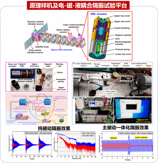 3、提出电-磁-液多场耦合驱动技术,采用电磁执行器进行低频主动隔振,采用液体阻尼进行中高频被动隔振,两者串行连接,实现主被动一体化低、中、高频超宽频微振动控制。